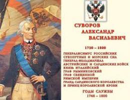 Александр Васильевич Суворов– выдающийся полководец, не испытавший ни одного поражения в своей военной карьере. Героический поход совершил Суворов, пройдя из Италии через швейцарские Альпы. Этот поход вошёл в военную историю как высочайший образец героизма, мужества, верности долгу и настоящий подвиг русского народа. Мы помним и ценим Суворова, восхищается его подвигами, мудростью, общением с солдатами. Его «наука побеждать» до сих пор помогает солдатам освоить военное искусство. Имя Суворова носит военное училище в Москве.