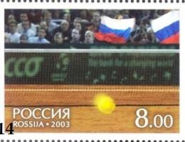 В том же году появился блок, не имеющий аналогов в мировой истории. Выпуск посвящен победе России в Кубке Дэвиса в 2002 году (рис.№14). На изображение теннисного корта нанесли тонкомолотый грунт с того корта, на котором и одержали победу наши теннисисты.