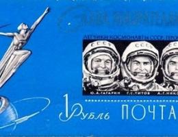В 1962 году в Советском Союзе выпустили марку «Слава покорителям космоса!» с изображением Юрия Гагарина, Германа Титова, Андрияна Николаева и Павла Поповича (рис. № 21) .Стоила марка 1 рубль. Размер ее (с зубцами и без зубцов) — 15 на 7 см (105 кв. см). Из-за большого размера миниатюру часто называют «маркоподобным блоком».