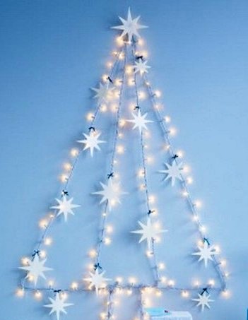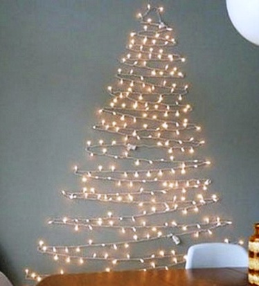 Например, если у вас много электрических гирлянд, то можно на стене создать красивые елочные композиции (фото 1 и 2).
