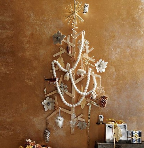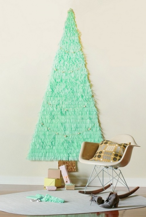 Главным атрибутом Нового года, без сомнения, является красивая, нарядная елка. Она создает в доме праздничную, уютную атмосферу. Сегодня в магазинах можно видеть большое количество разнообразных елок. Однако, что делать, если в квартире просто нет места для елки. В этом случае можно новогоднюю красавицу создать прямо на стене из самых необычных подручных материалов.