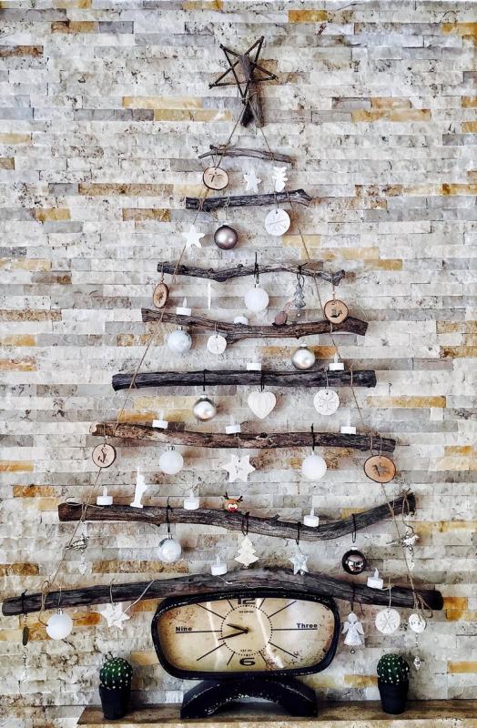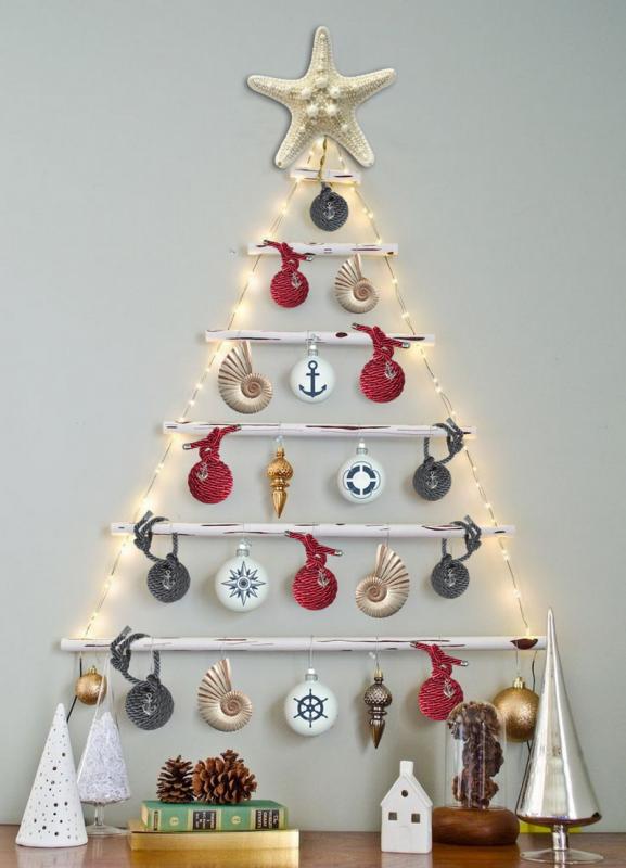 . Вариант елочки с ветками деревьев (фото 6) подойдет для интерьера гостиной и обязательно понравится взрослым и детям. Можно для новогодней елочки использовать ракушки, камушки, засушенные морские звезды. Многие люди, которые отдыхают на море, привозят их с собой на память (фото 7).