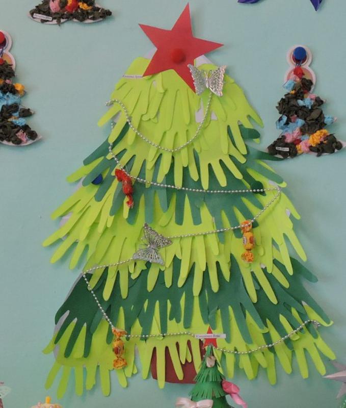 Для тех, кто любит семейное творчество, мы предлагаем изготовить елку из бумажных ладошек (фото 9). Получается красивая елка из ладошек, которую можно украсить любыми игрушками.