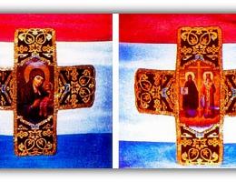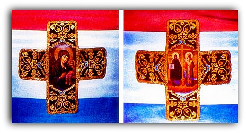 Эскиз необычного дара изготовил художник Николай Евстафьевич Симаков. На одной стороне красно-бело-синего полотнища он изобразил в черном кресте, украшенным золотыми арабесками, славянских первоучителей Кирилла и Мефодия. На другой – икону Иверской Божьей матери, во имя которой в Самаре был основан женский монастырь. Его монахини вышили безвозмездно Самарское знамя.