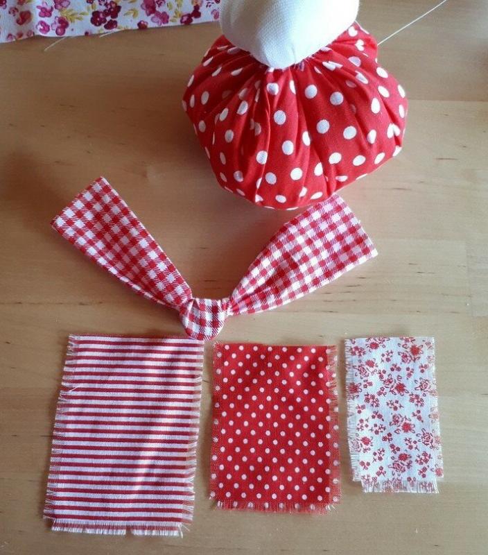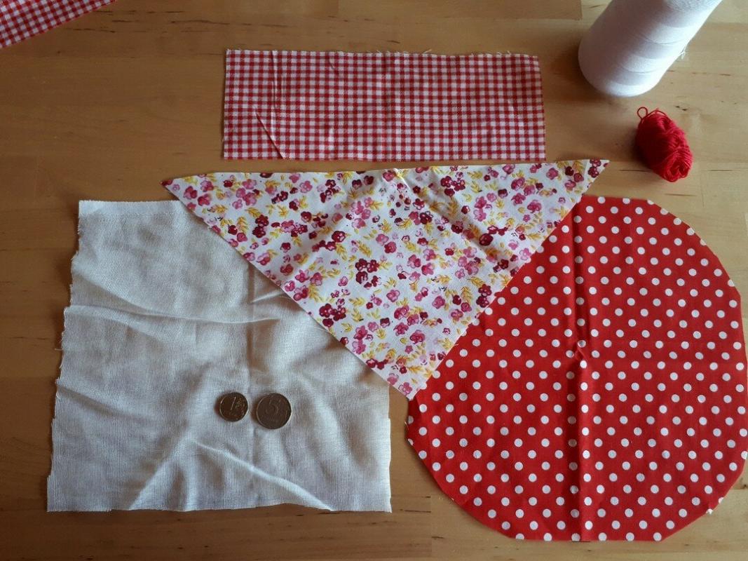 Для того, чтобы сделать куклу «Благополучницу», нужна натуральная ткань - белая для лица, цветная для юбки, платка, рук, фартука. Также надо подготовить нитки для обмотки белого или красного цветов, монетки, наполнитель - вата или можно использовать травы (фото 2).