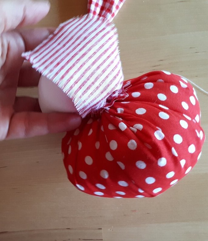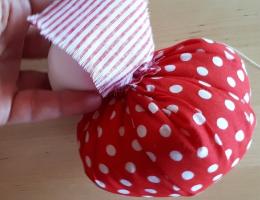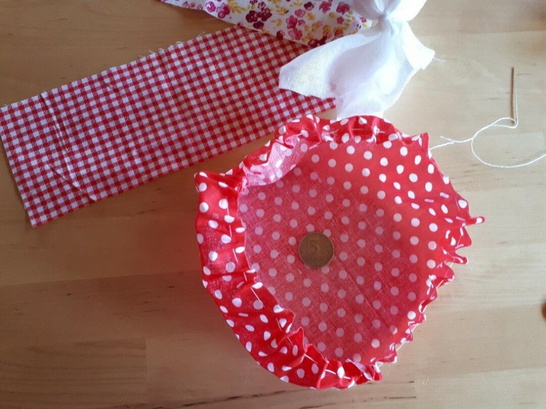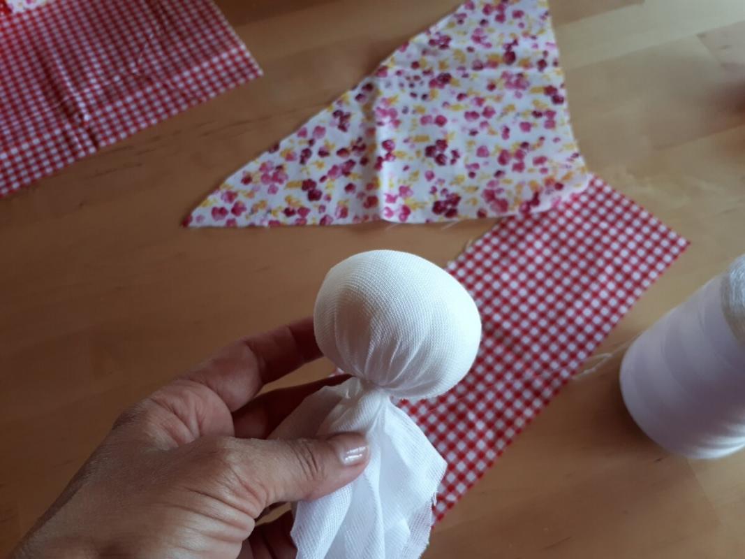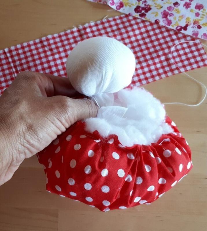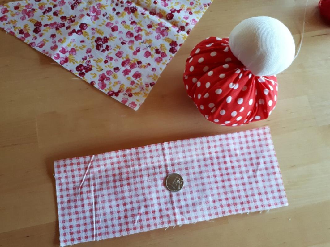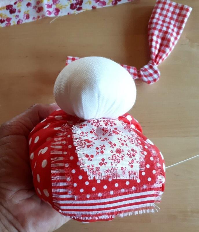 Получилась головка куклы (фото 3). 2. В центр юбки положите монетку, наполнитель, а потом стяните ниткой, вставьте головку и завяжите (фото 4, 5). 3.