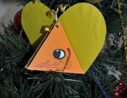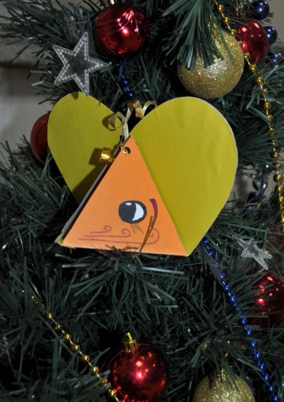 Из плотной бумаги или картона можно сделать и объемную мышку (или другое животное). Такая поделка не только украсит елку, но и станет необычной упаковкой для маленького подарка на елочке (фото 3).