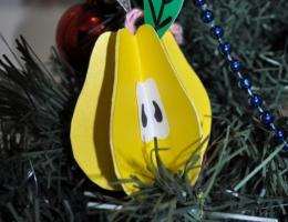 Если говорить о бумаге и картоне, это самый популярный материал на наших мастер-классах. Например, красивая многослойная груша (фото 2) очень легко изготавливается. Надо только по одному лекалу вырезать много деталей и склеить как гармошку. Прекрасная игрушка на елку! Можно сделать вместе с детьми!