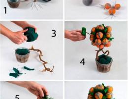 Например, из мандаринок можно сделать топиарий,который украсит в новогодние праздники любой стол.