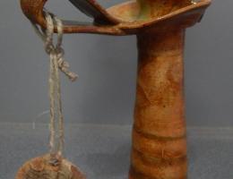Изготовитель: Сербия, г. Бачка-Паланка. Время создания: начало XXI века. Материал: глина. Подсвечник изготовлен из обожженной глины в форме конусообразной трубы, зауженный в верхней части. Сам подсвечник имеет форму полой трубки, прикреплен к чаше. С одной стороны чаши ручка выполнена в форме петли. Чаша стоит на конусообразной трубе. К ручке чаши крепится на веревке глиняная круглая печать с надписью: "Бачка Паланка". Подсвечник покрыт лаком.