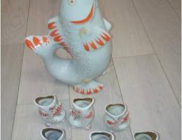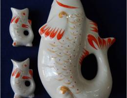 Столовый набор "Рыбы". Графин и 2 рюмки. Изготовитель: Полонский фарфоровый завод художественной керамики УССР. Время создания: 1970-1979 гг. Материал: фарфор. Красивый атрибут из советского прошлого. Такие рыбки были во многих домах советских людей. А сегодня это уже почти раритет.Графин выполнен в виде рыбы, семейства карповых, стоящей вертикально и опирающейся на хвост. Рюмки представлены в виде маленьких рыбок, стоящих вертикально и опирающихся на хвост. Основные цвета: белый, красный, золотой. На тулове графина и рюмок - чешуя рыбы. Поверхность гладкая.