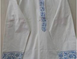 Рубаха мужская сшита на машинке, из белого льна, косоворотка, рукав длинный широкий, ворот стойка. Воротник, низ рукава и рубахи украшены машинной вышивкой нитью голубого цвета. Подарена в феврале 1935 года жениху Скрябневу Михаилу Семеновичу от невесты Ковалевой Степаниды (г. Иваново Московская область).