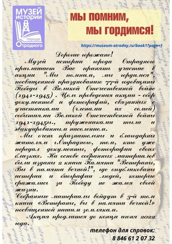 Материалы бержно собирали сотрудники музея истории города Отрадного. Время неумолим бежит вперед, безжалостно забирая тех, кто боролся за Победу. Год от года редеют ряды Ветеранов войны и все меньше остается среди нас живых свидтелей войны. В настоящее время в городе Отрадном проживают всего 7 участников Великой Отечественной войны.