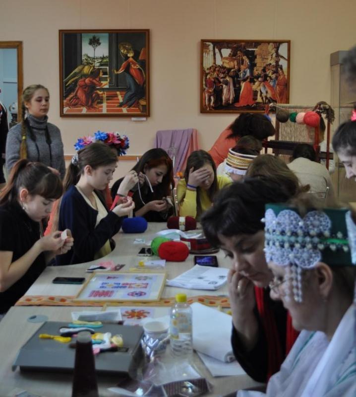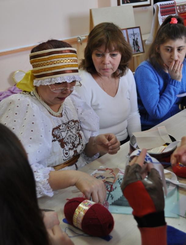 18 февраля сотрудники городского музея истории Отрадного принимали гостей – замечательных мастериц из села Петровка Борского района. У себя на родине они создали этнографическую гостиную «Анкли», что в переводе с финно-угорского языка означает «матушка». Там женщины занимаются возрождением старинных народных ремесел. А в Отрадный они приехали, чтобы поделиться опытом с местными рукодельницами. В нашем музее с 2013 года работает мастерская «Радость творчества» для людей с ограниченными возможностями здоровья. Здесь обучают бисероплетению и изготовлению цветов из ткани. Это очень интересно и увлекательно, но люди хотят осваивать новые ремесла. И такая возможность появилась благодаря участию в конкурсе социальных и культурных проектов ПАО «ЛУКОЙЛ». Теперь на базе мастерской «Радость творчества» тоже создана этногостиная «Отрадушка», а мастерицы из Борского района обучат наших женщин всему, что умеют делать сами. А умеют они действительно очень многое. Руководитель «Анкли» Валентина Георгиевна АНДРЕЕВА – мастер по художественной обработке кожи и меха, резчик по дереву и бересте, искусная вышивальщица. Насиба Байрамовна ИСМАЙЛОВА знает все секреты ковроткачества. Галина Вениаминовна ЦЫГАНКОВА занимается вышивкой. Ирине Николаевне ГЛУХОВОЙ от начала и до конца известен процесс прядения. Она держит овец, знает, когда их нужно стричь, как правильно мыть и чесать шерсть. Да и прялок у нее несколько. В этот раз она привезла с собой самую маленькую и изящную прялку. Татьяна Александровна ПАНАРИНА занимается вязанием. Она призналась, что когда вспоминает свое первое изделие – носки, связанные в молодости для мужа, то готова сгореть от стыда. Но не зря говорят, что дело мастера боится. Сегодня ее изделиям позавидует любая модница. К сожалению, на выставку не смогла приехать Вера Романовна СОРОКИНА. Но коллеги привезли ее ажурные скатерти и шали, и посетители имели возможность любоваться ими. Все борские мастерицы были одеты в народные костюмы, которые изготовили собственными руками. Также они привезли с собой настоящие раритеты – народные костюмы прошлых столетий. На выставке были представлены марийское свадебное платье, халат шабыр и головной убор. Все соткано вручную. Платье и шабыр датируются 1910 годом, а рушник, который является частью свадебного костюма, вышит в 1890 году. Посетители могли увидеть и старинное чувашское платье. Гости попросили обратить внимание на узоры: ромбы на плечах и подоле характерны только для чувашей Борского района. Руководитель «Анкли» В.Г.Андреева оказалась замечательной рассказчицей и очень располагающим к себе человеком. Люди буквально тянулись к ней, стремились прикоснуться, сфотографироваться на память. Какой же сильной нужно быть, чтобы оставаться добрым и светлым человеком, когда жизнь наносит тебе удары! А судьба ей выпала нелегкая. В прошлом она была балериной, но полученная травма перечеркнула привычную жизнь, и пришлось начинать все сначала. Валентина Георгиевна стала преподавать мировую художественную культуру в школе. А еще набрала свой танцевальный коллектив – более 100 человек. Но прежде чем поставить какой-либо танец, она тщательно изучала историю народа, особенности их костюмов. Информация постепенно накапливалась, и однажды она подумала: «А почему бы серьезно не заняться де