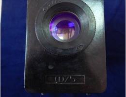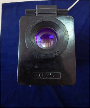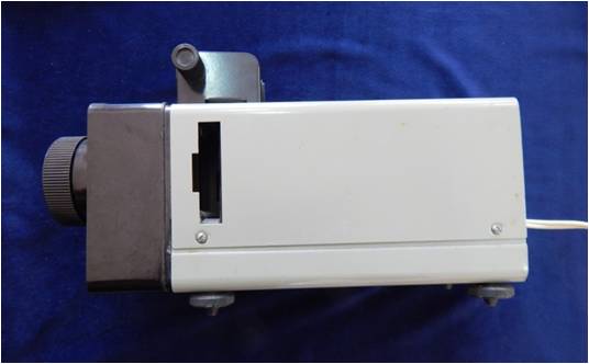 Изготовитель: Завод школьного приборостроения № 6 г. Загорск. Время создания: вторая половина XX века. Материал: металл, стекло. В СССР было принято называть оптические приборы разных классов фильмоскопами. Аппарат, с помощью которого мы просматривали с вами диафильмы, называется диапроектор, хотя в народе его и называли фильмоскопом. Наибольшую популярность приобрёл в XX веке. В продаже, помимо диафильмов для детей, имелись наборы диапозитивов на определенные темы. Чаще всего это были фильмы на темы - искусство, музеи, история, география. Учебные диафильмы и диапозитивы широко применялись в школах, средних специальных и высших учебных заведениях. Иногда, эти самые учебные диафильмы и диапозитивы самостоятельно изготовлялись студентами-фотолюбителями (студенческая научная работа на кафедрах, студенческом научном обществе, факультативы). В организациях и на предприятиях рабочим и служащим демонстрировались диафильмы по гражданской обороне и технике безопасности труда. Диапроектор (фильмоскоп) – «Ф75-1М». Эта модель выпускалась в Загорске (ныне Сергиев Посад). Главное отличие от всех предыдущих— его универсальность. Диапроектор позволяет просматривать как диафильмы, так и слайды. Кроме того, корпус аппарата металлический, жесткий, покрыт серой краской, все части хорошо подогнаны, объектив в оправе сидит жестко. На фильмоскопе по бокам разъем для фиксации рамы для слайдов. Диафильмы демонстрируются ровно, ручка прокрутки диафильма двухсторонняя, очень удобная и не разбалтывается. Слайдовый адаптер рассчитан на два слайда: во время демонстрации одного кадра вы имеете возможность вставить в него следующий слайд. Прекрасно работает с картонными слайдовыми рамками. К его недостатку можно отнести лишь протяжку пленки под днищем аппарата, в связи с чем пленка диафильма быстро изнашивается. Все четыре ножки регулируются по высоте, хотя и незначительно. Хорошо продуман система вентиляции – диапроектор не светит из всех щелей в разные стороны. Используется объектив типа перископ. Максимальный размер изображения 2 метра по диагонали. Трансформатор расположен не сбоку, как обычно, а за лампой. Стоил такой диапроектор 13 рублей.
