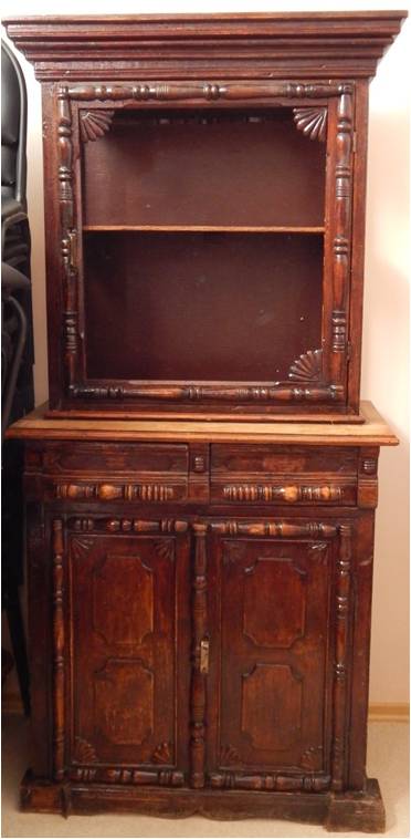 Есть небольшая столешница шириной 13 см. Нижняя часть серванта – это большое отделение с двумя полками, которая закрыта непрозрачным фасадом. Металлические ручки-скобы прямоугольной формы. Сверху сервант украшен ступенчатым карнизом. Дверцы по периметру обрамлены полукруглыми балясинами. Корпус серванта имеет рельефную фактуру, украшен декоративной резьбой. Нижняя часть серванта имеет тяжёлое основание без ножек.