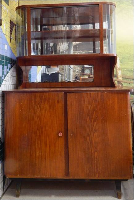Деревянный буфет коричневого цвета состоит из нижней тумбы с распашными дверями и верхнего шкафчика, установленного над тумбой. Верхний и нижний отделы разделены нишей со столешницей. Верхняя часть буфета выполненная в форме эллиптического цилиндра, представлена в виде закрытого шкафчика с остекленными раздвижными дверями и стеклянными боковыми стенками.