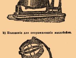Маслобойки были деревянные, железные и жестяные. Относительно чистоты, последние два материала представляются более удобными, если только они покрыты эмалью, хотя последняя очень легко портится. Деревянные легче удерживают температуру налитого в них молока или сливок и не требуют приспособления особых предохранительных кожухов, какие устраиваются в железных.