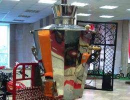 - Признанный же самовар-рекордсмен был изготовлен из нержавеющей стали в 2014 году в Перми и отмечен в «Книге рекордов России». Его высота с трубой – 2,5 м, и при объеме 555 литров воды он может «напоить» сразу 2220 человек.
