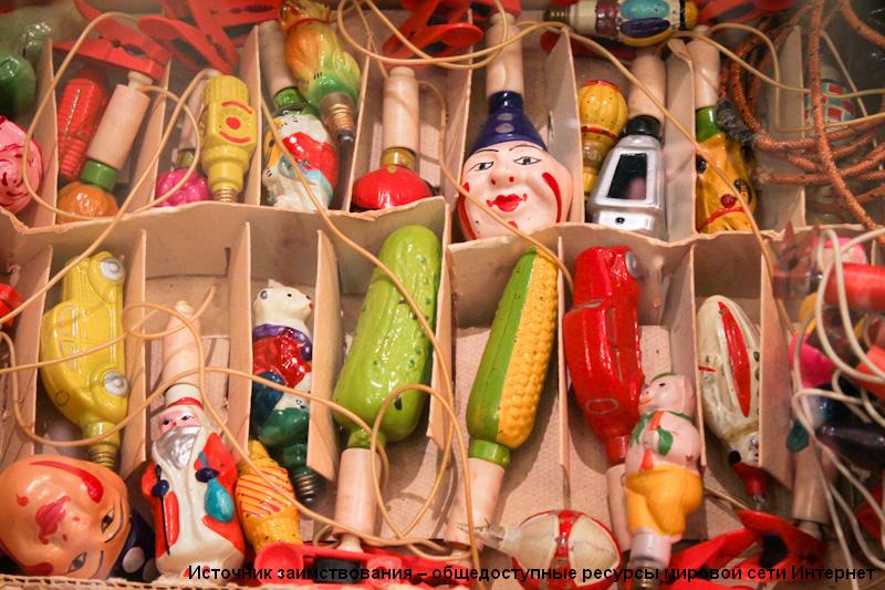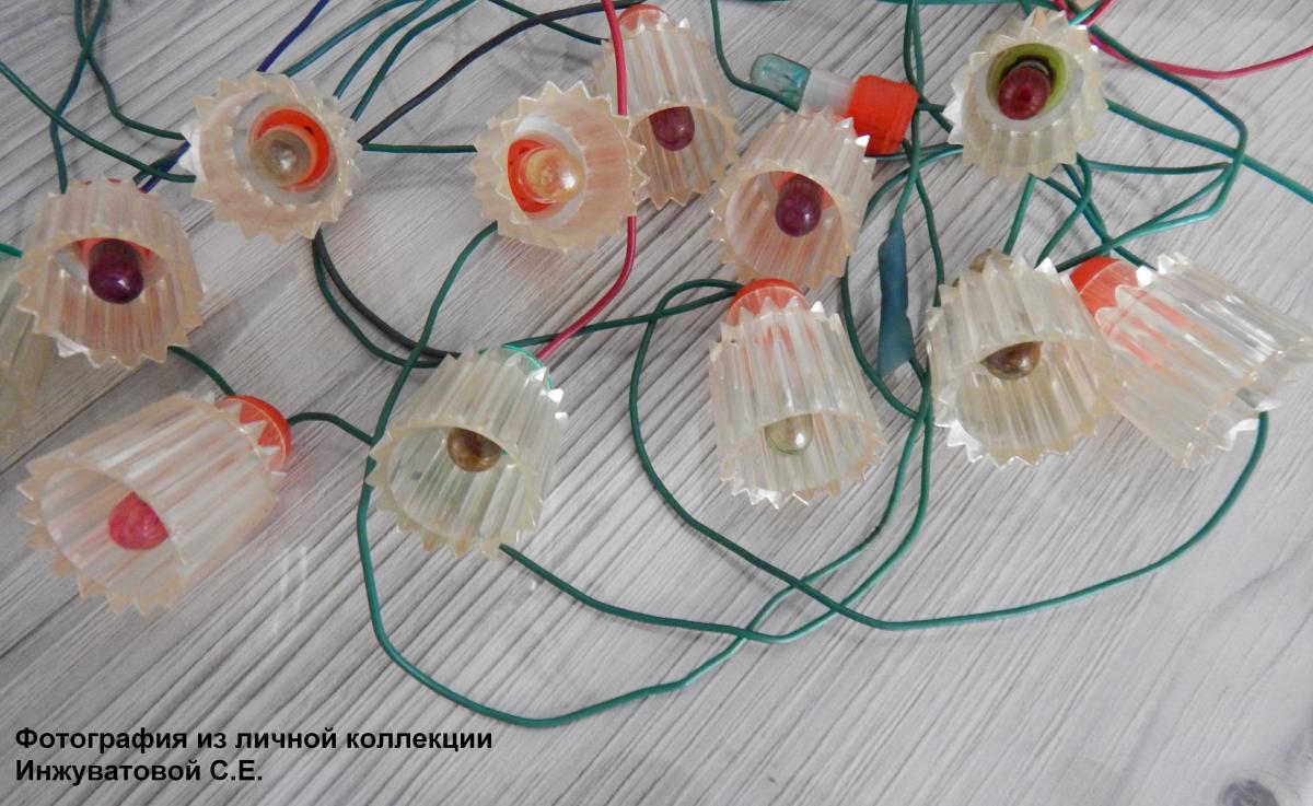 В конце 50-х годов появляются гирлянды из лампочек-фигурок: внутри фигурки из толстого стекла закреплялась нить накаливания, а сама фигурка вставлялась в цоколь, который был закреплен на проводе.