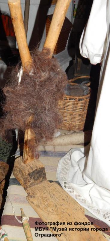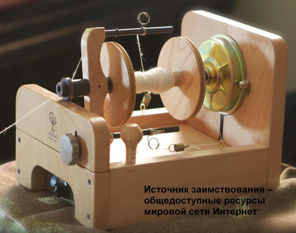 Ручная деревянная прялка – это был наиболее распространенный, а главное, доступный для предков прибор для изготовления нитей. Существовали прялки из цельного дерева и такие, где каждая отдельная часть была выполнена из другого вида древесины. На Руси прялки делали из клёна, осины, берёзы, липы. Ручная прялка состояла из вертикальной части, куда привязывалась кудель и горизонтальной (донце), где сидела пряха. Вертикальная часть состояла из лопаски (лопати) и шейки (ножки). Прялку, особенно лопаску, часто украшали и расписывали. По конструкции можно выделить два вида прялок: цельные (делались из корня и ствола дерева) и составные (состояла из двух деталей, горизонтальной и вертикальной).