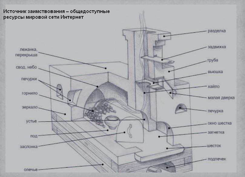 Наглядно с основными элементами сооружения можно ознакомиться по схеме. Пространство между полом и печью называлось подпечье, использовалось для печного инструмента и иногда в нём содержали молодняк мелких домашних животных.