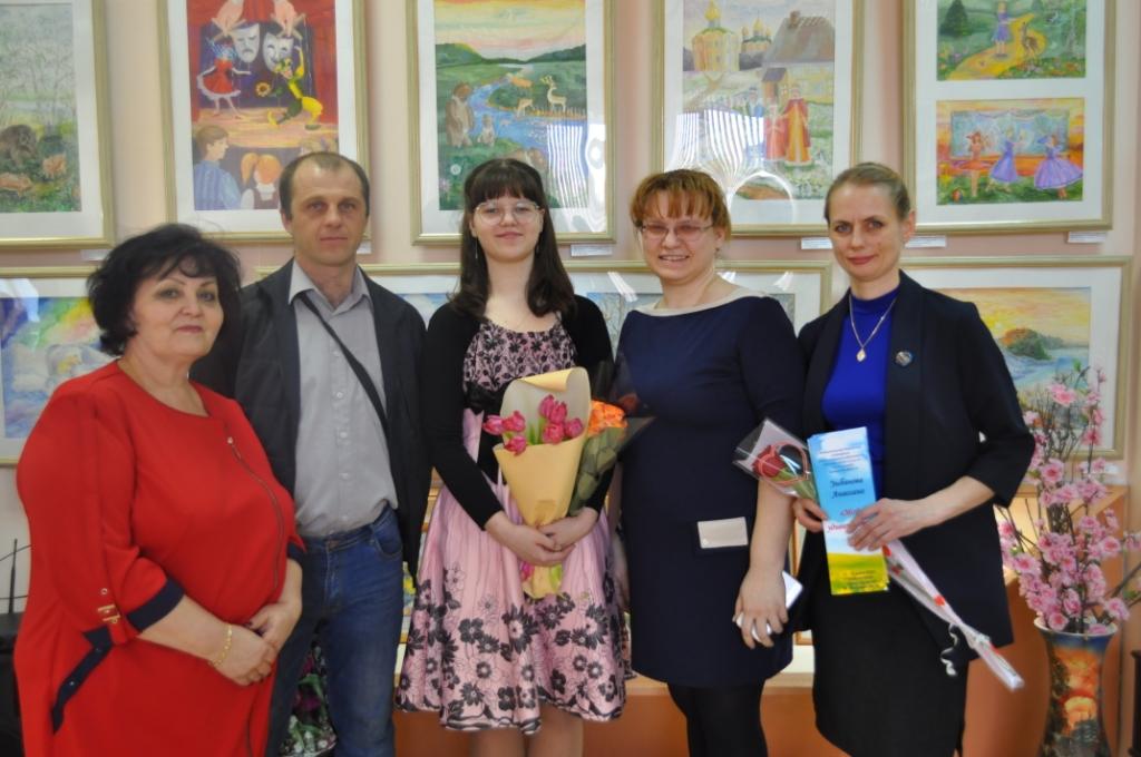 С большим событием в творческой жизни поздравили художницу начальник отдела культуры Е.С.Титова, классный руководитель школы №6 Е.Н.Калугина, директор музея Г.Т.Гурьянова, мама Е.В. Зыбанова.