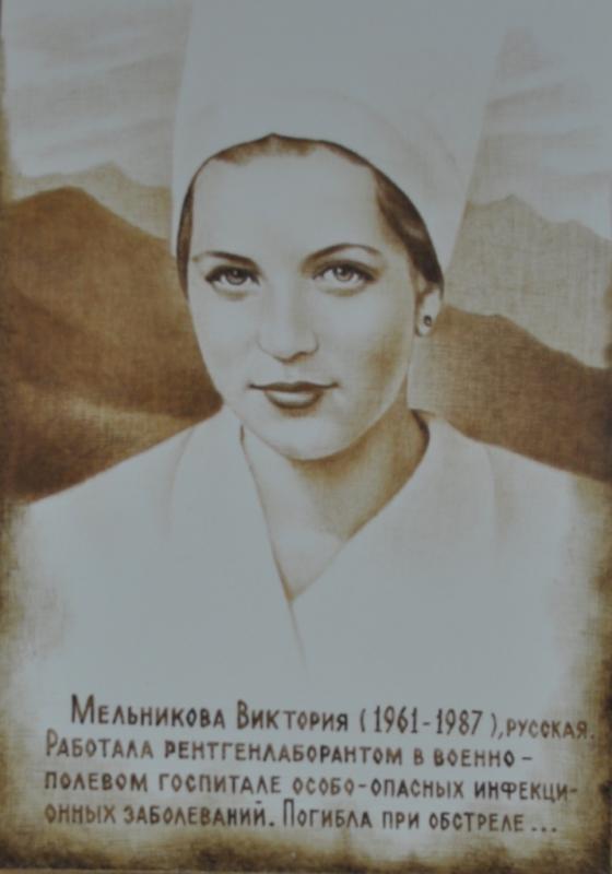 Мельникова Виктория (фото 11) работала рентгенлаборантом в 834 военно-полевом госпитале особо опасных инфекционных заболеваний в Джелалобаде. Погибла в автомобильной катастрофе при обстреле колонны. Награждена посмертно орденом Красной Звезды.