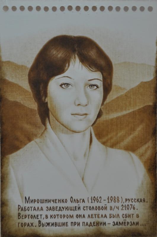 Мирошниченко Ольга (фото 13) работала заведующей столовой военной части 21076 г. Газни. Погибла в разбившемся в горах вертолете от тяжелых травм и переохлаждения.