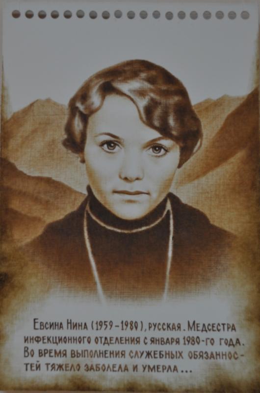 Евсина Нина (фото 3). Самая первая и самая молодая из погибших женщин в Афганистане. Ей был всего 21 год. Получила среднее медицинское образование. Попала в Афганистан добровольно. Работала там медсестрой инфекционного отделения. Тяжело заболела и умерла.
