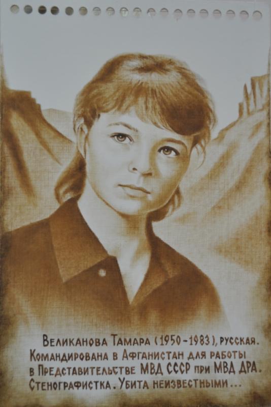 Великанова Тамара (фото 5) проработала 5 лет в Центральном аппарате МВД СССР стенографисткой, была командирована в республику Афганистан для работы в Представительстве МВД СССР. На родине оставила у родителей маленького сынишку. Часто угощала афганских ребятишек сладостями, один из которых очень напоминал ей сына. Была зверски убита в квартире, где в нарушении инструкций в обед осталась одна. Через стекло закрытого гроба было видно, несмотря на грим, ссадины, синяки и порезы на лице. И воротник платья закрывал полностью шею. Посмертно награждена орденом «Знак Почета»