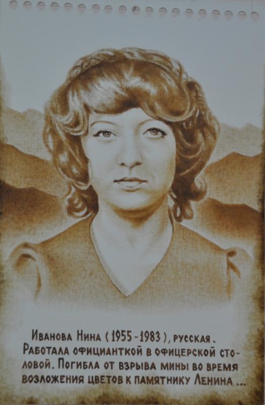 Иванова Нина (фото 6). Красавица. На родине работала стюардессой. В Афганистане работала официанткой в офицерской столовой. Погибла от взрыва во время возложения цветов к памятнику Ленина в Кабуле…