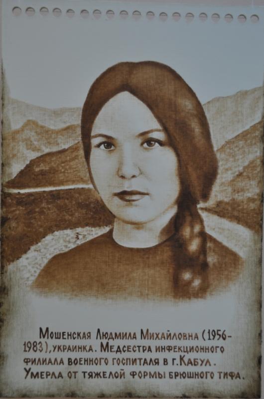 Мошенская Людмила (фото 7) в Афганистане служила медсестрой инфекционного отделения отдельного военного госпиталя военной части 94777(650) в г. Кабуле. Тяжело заболела и за месяц до замены умерла от тяжелой формы брюшного типа…
