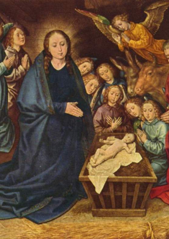 Образ мадонны разнообразно раскрывается во многих полотнах художников эпохи Возрождения. В середине и во второй половине XV века в работах Нидерландских художников особенной прелестью обладают композиции, проникнутые кротким, созерцательным настроением. Они прибегают к сюжетам рождества и поклонения младенцу, эти сюжеты решаются ими тонко и простодушно. В «Поклонении пастухов» Гуго ван дер Гуса (фото 4,5), младенец очень худенький, как всякое новорожденное дитя, окружающие смотрят на него, беспомощного и скрюченного, с глубоким душевным умилением, мадонна тиха, не подымает взора, но чувствуется, что она полна скромной гордостью материнства. А за пределами яслей виднеется пейзаж Нидерландов, широкий, холмистый, с извилистыми дорогами, редкими деревьями, башнями, мостами.