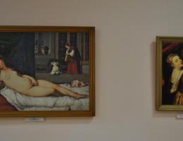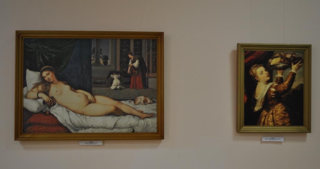 В многообразной панораме выставки нелегко выделить отдельные примеры, и все же репродукция  картины Тициана «Венера Урбинская» достойна этого по праву. Картина написана по заказу герцога Урбинского.  Возможно прототипом Венеры Урбинской послужила юная невеста Гвидобальдо. По другой версии моделью для картины послужила возлюбленная Тициана, высказывалось также предположение, что на картине могла быть изображена мать Гвидобальдо (источник https://ru.wikipedia.org/wiki/Тициан).