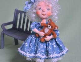 Кукла «Кудряшка». Маленький курносый носик, голубые глаза, белокурые кудряшки на голове, ручки, нежно и заботливо обнимающие любимую игрушку. А как внимательно и точно автор подмечает все необходимые детали изделия!