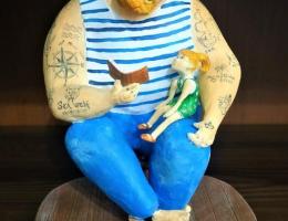 Композиция «Мой папа». В данной композиции автор использует интересный прием контрастов в размерах и образов папы и ребенка. Художник осознанно создает контраст и в пропорциях фигуры папы (большое тело и маленькие кисти рук и стоп) и мастерски выражает в фигуре, взгляде, наклоне головы любовь отца к маленькой дочери.
