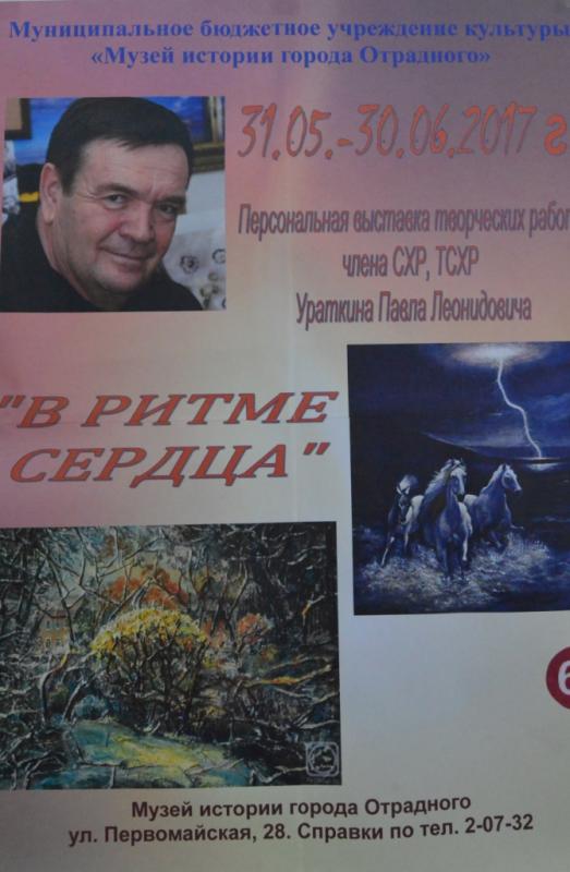 В настоящий момент в городском музее истории проходит персональная выставка работ председателя отрадненского Творческого союза художников Павла Леонидовича УРАТКИНА. Называется она символично — «В ритме сердца».