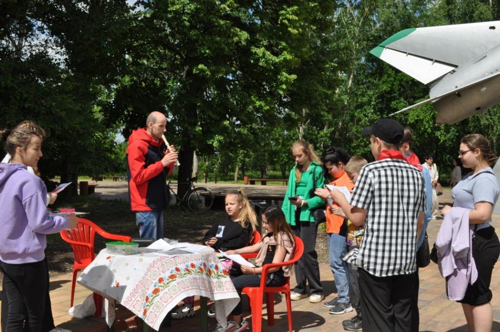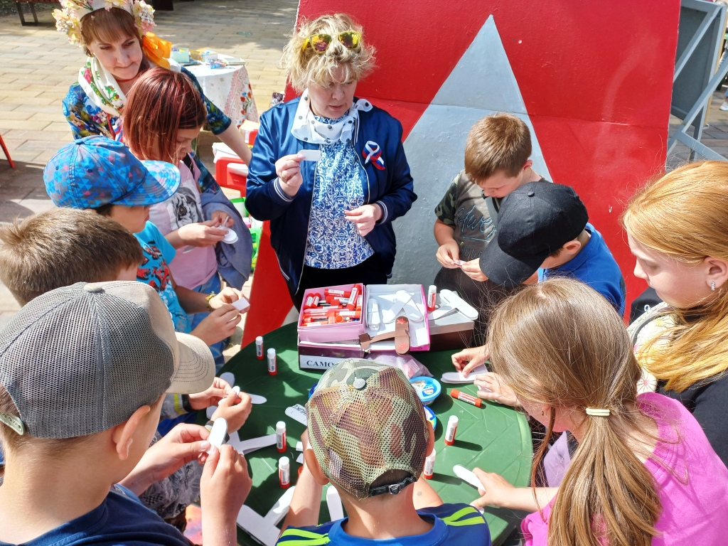 На стации «Музыкальная» волонтер культуры Стебенюк И.В. играл на флейте гимн РФ, песни «Катюща», «Смуглянка», «День Победы», «В землянке», а ему дружно подпевали взрослые и дети.