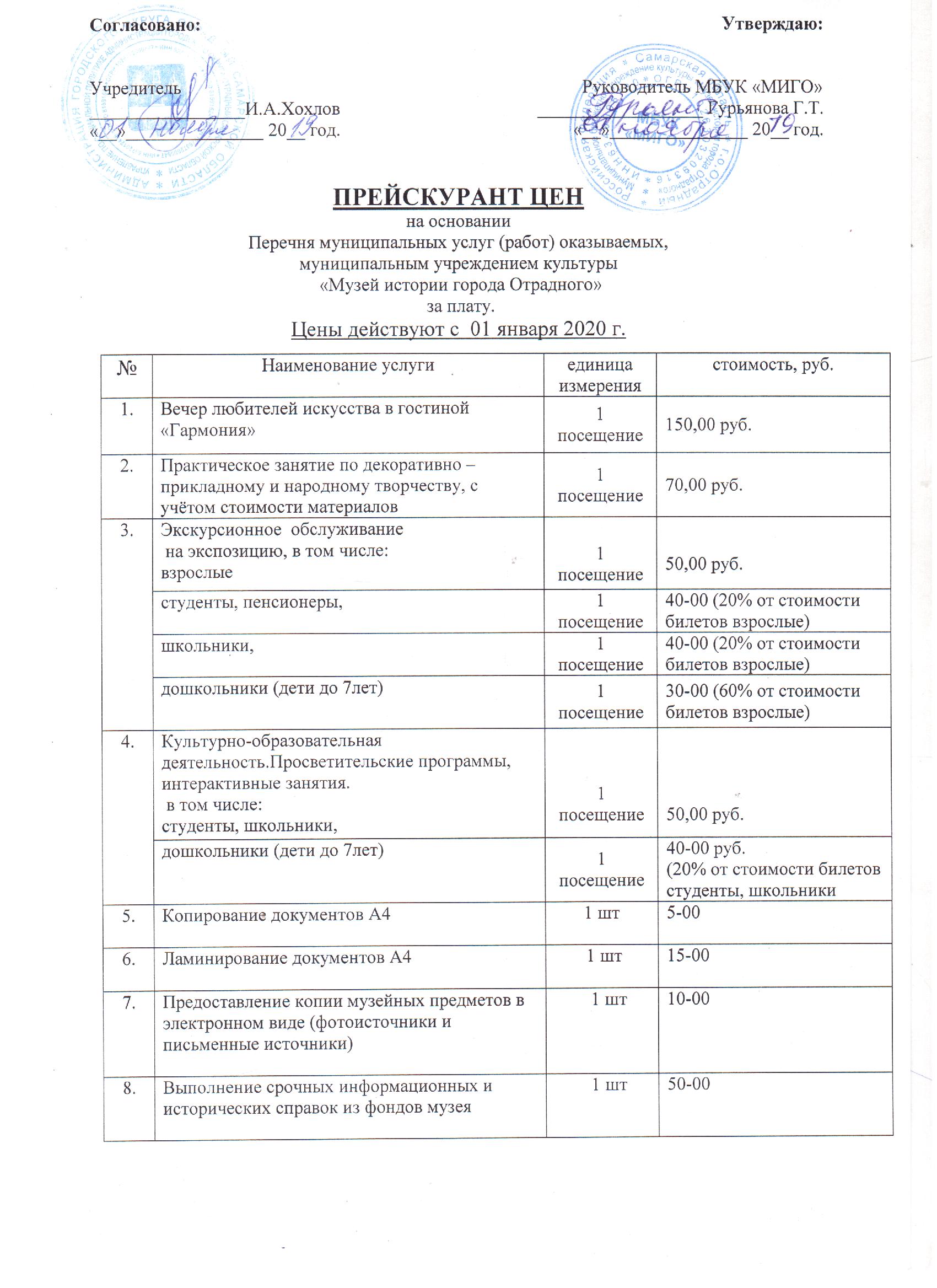 Прейскурант цен МБУК "Музей истории города Отрадного" на 2020 год