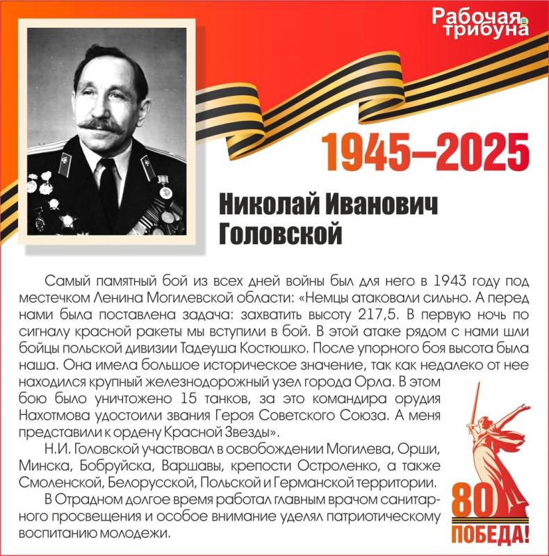 Фронтовики построили наш Отрадный, воплотив свои мечты о мирной жизни, трудились на нефтепромыслах, предприятиях, в образовании и здравоохранении.  Сегодня наш герой - Николай Иванович Головской.