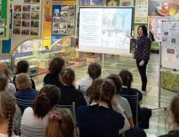 Экскурсовод Катникова А.А. провела ребят по тропам истории, рассказала о зарождении этого трогательного праздника, о народном поэте Дагестана Расуле Гамзатове, чьи строки подарили миру бессмертную песню «Журавли».