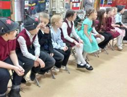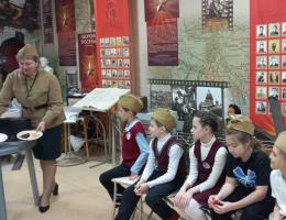 Под строевую песню и команды экскурсовода Писчасовой М.В. школьники входят в Зал Славы и Памяти. Мальчишки и девчонки надевают пилотки и будёновки, командиры получают фуражки, и игра начинается!