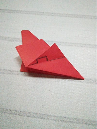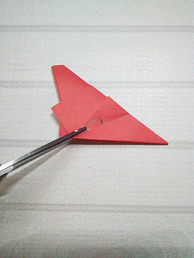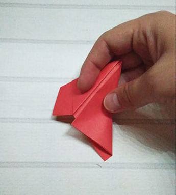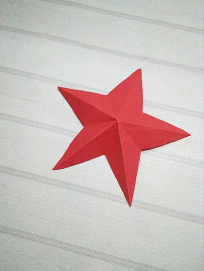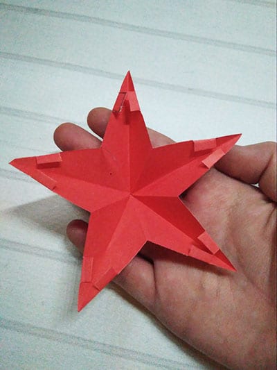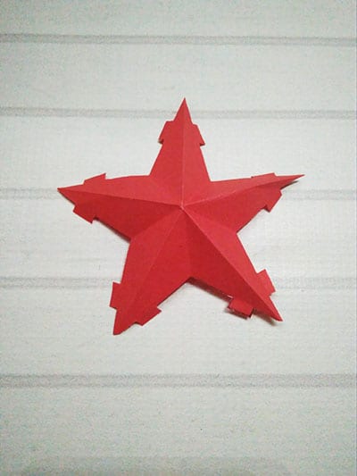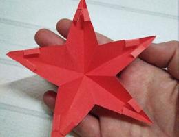 Затем направим этот уголок в противоположную сторону, хорошо продавим по сгибу, чтобы зафиксировать бумагу в таком положении. Подогнем вниз верхний уголок правой половинки листа и сложим нашу конструкцию вдвое. Затем перевернем и подогнем вниз уголок треугольника, находящегося у самого кончика конструкции. Вернем этот уголок в первоначальное положение, а линию сгиба обведем карандашом. Нарисуем на ней небольшую прямоугольную выемку. Обрежем лишнюю бумагу, следуя по карандашному контуру. У нас получается один элемент звездочки.Но если его развернуть, то получится целая звезда с креплениями на каждом луче. Загибаем крепления внутрь.И звездочка приобретает аккуратный вид. При этом она получается объемной, а крепления на внутренней стороне позволят ее приклеить, сохраняя объем.