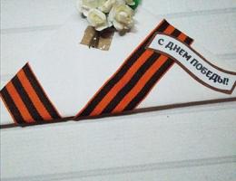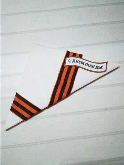 Возвращаемся к нашей открытке. Оборачиваем ее георгиевской ленточкой. Наклеиваем поздравительную надпись на коричневую бумагу. Обрезаем по краям. Наклеиваем надпись на уголок открытки. Берем зеленую бумагу и вырезаем из нее множество одинаковых листиков. В верхний уголок открытки приклеиваем букетик цветов и листики. Затем приклеиваем букетик цветов и листики. Смазываем клеем крепления звезды. Приклеиваем звездочку в центр треугольника, подкладывая снизу зеленые листочки. Открытка готова.