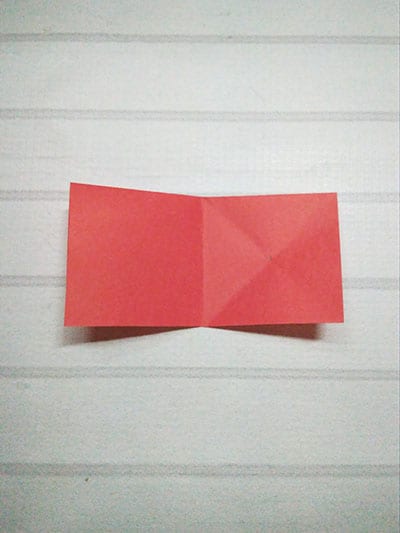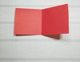 Теперь приступим ко второй части работы – созданию пятиконечной звезды, которой будет украшена наша открытка «Фронтовой треугольник» к 9 мая. Шаблон звезды найти не составит труда, но лучше всего сделать звездочку в технике оригами.Возьмем красный двухсторонний бумажный квадрат. Согнем его пополам и разрежем на два равных широких прямоугольника. Возьмем один из них, сложим пополам, затем развернем. Должен быть хорошо виден сгиб. Подведем к этому сгибу верхний уголок одной из половинок прямоугольника, а затем развернем. Точно также подогнем нижний уголок.Теперь получились две линии сгиба, которые пересекаются в одной точке. Подведем к этой точке верхний уголок ранее не использовавшейся половинки.