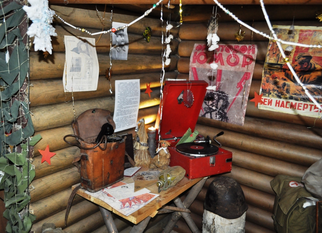 Погрузиться в атмосферу военных лет поможет интерьер фронтового блиндажа. Здесь маленькая елочка украшена вместо ёлочных игрушек ватой, использованными гильзами. Заинтересует гостей музея фронтовой светильник, сделанный из гильзы и подаренный ветераном войны Казаковым А.В. , и многие другие интересные экспонаты. В экспозиции выставки демонстрируются подлинные вещи 1940-х гг.: патефон, рация, варежки, шерстяные носки, кисет для табака, гимнастерка нашего земляка, пробитая пулей,которая принадлежала участнику Великой Отечественной войны Маткину Федору Степановичу.