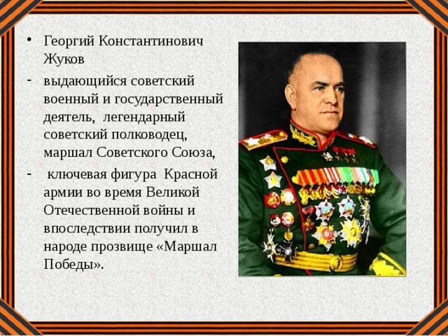 Константин Георгиевич Жуков - советский военачальник, маршал Советского Союза министр обороны СССР, четырежды Герой Советского Союза, кавалер двух орденов «Победа» и множество других орденов и медалей. Под его командованием во время Великой Отечественной войны советские войска одержали победу во всех главных сражениях. В настоящее время в армии учреждена медаль имени Жукова за мужество и героизм.