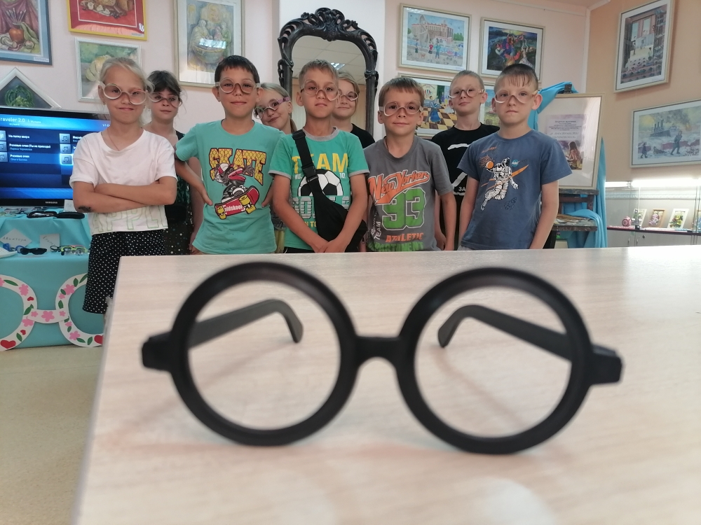 Экскурсовод Писчасова М.В. подготовила для ребят много сложных вопросов. Например, чем отличаются очки - авиаторы от тишейдов или леннонов, как выглядят самые необычные оправы для солнечных очков, сколько насчитывает и кому принадлежит самая большая коллекция солнечных очков. Ребята отлично ответили на все вопросы, а затем дружно смастерили большие красочные очки для фотосессии.