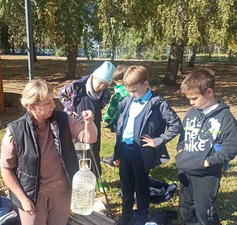 С особым интересом ребята наблюдали, как экскурсовод музея Мария Писчасова при помощи верёвки и узлов делает ручку-переноску для пятилитровой бутылки ПЭТ. И сами успешно повторили эту схему!